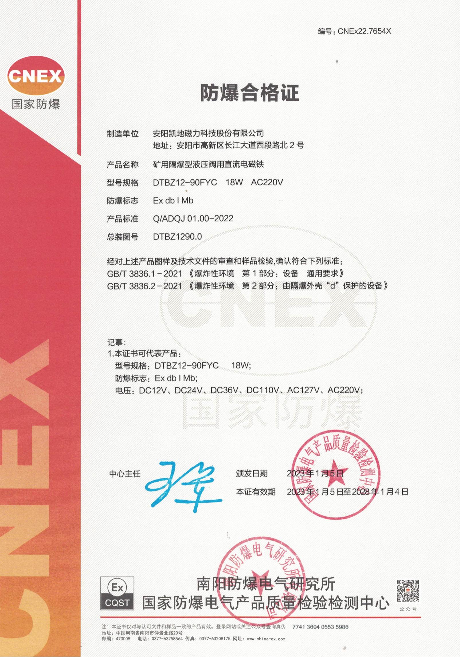 CNEx22.7654X DTBZ12-90FYC 1類防爆合格證 有效期至2028年1月4日